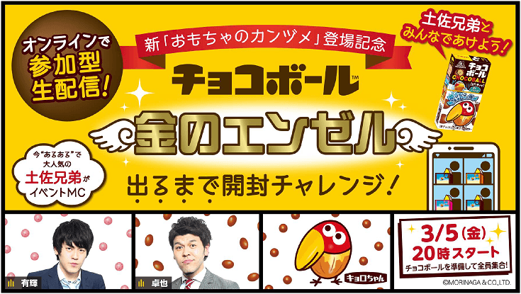本イベントは、ロングセラー商品「チョコボール」の『金のエンゼル』(銀のエンゼル5枚)を当てるともらえる、「おもちゃのカンヅメ」のリニューアルを記念して企画しました。「『金のエンゼル』って本当に出るの?」というお客様の声を検証するため、人気芸人・土佐兄弟が、『金のエンゼル』を当てるまで視聴者と一緒に「チョコボール」を開封し続けます。配信は20時から開始し、毎時15分と45分の2回はZoomから参加した最大98人の視聴者と一斉に土佐兄弟を含めた100人で開封を行います。その他、開封の合間に様々な企画が用意されており、最初から最後まで余すところなく楽しめるオンラインイベントとなっています。