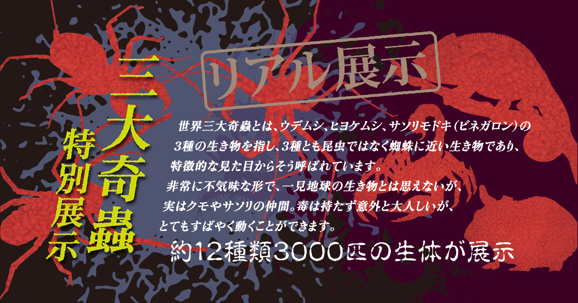 多くの人は、それらの生き物に対してまずは嫌悪感を抱くと思いますが、どの生き物もそれぞれが生息する環境の中でお互いに影響を及ぼし合いながら役割を果たして生きています。人間が、「気持ち悪い」と感じる姿形や色、生態は、生き物たちが生きていくための創意と工夫が詰まった、とっておきのフォルムであり、他には変えられない生き方なのです。貴重な生き物たちの「気持ち悪い」から1歩踏み込んで、じっくりと観察することができるため、来場者からは「珍しい生き物が見られてよかった」、「知らなかった生体の勉強になった」など、多くの反響が届いていました。また、様々な環境に順応しながら進化してきた個性的な生き物達との出会いは、見る人すべての知的好奇心を刺激するでしょう。