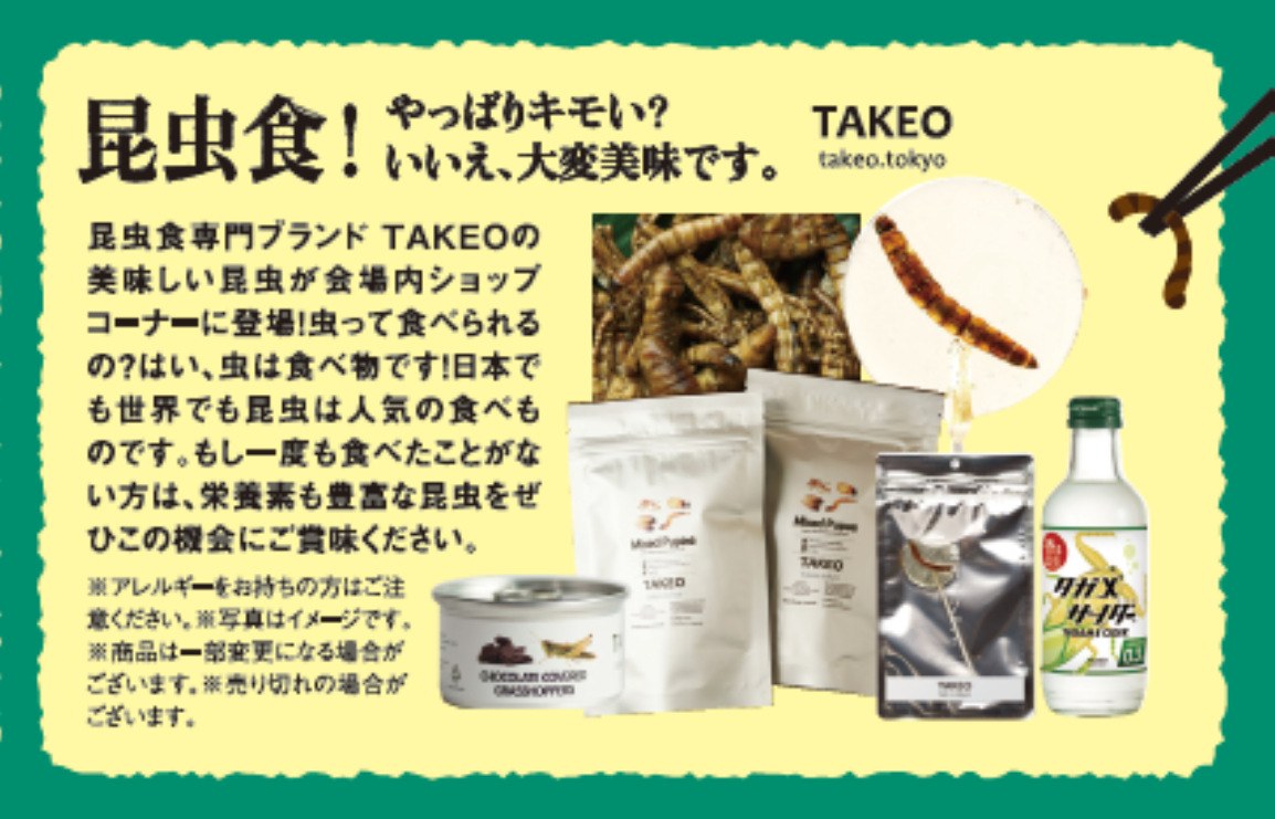 会場内の物販コーナーにて昆虫食専門ブランド TAKEOのおいしい昆虫食を販売します!食べるというイメージがない虫ですが、一度食べてみると、案外食べられるかもしれません。興味のある方はこの機会にぜひ一度ご賞味ください。