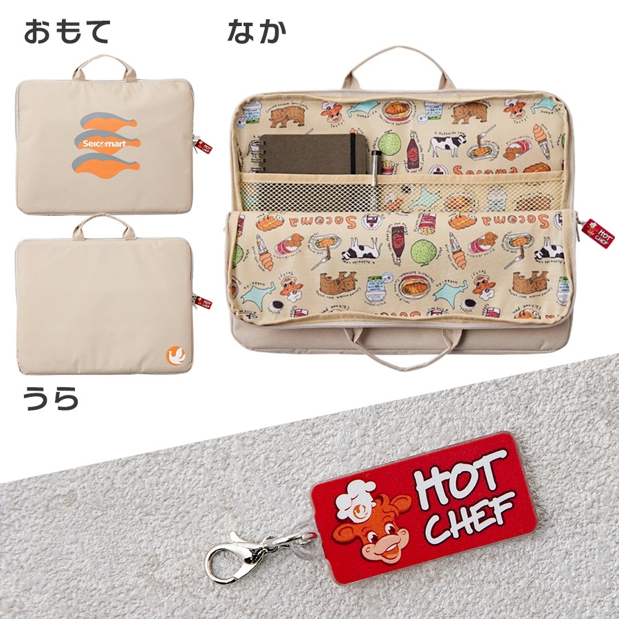 さらに、このムック本でしか手に入れることのできない「シャケ柄 A4 マルチポーチ」と「ホットシェフミニチャーム」の特別付録付き!「シャケ柄 A4 マルチポーチ」は昨年好評につき追加製造したあのエコバックに次いで、北海道らしい「シャケ柄」のデザインを起用しました。ポーチの内側も「ゆるセコマ」イラストの総柄で、北海道を感じられるデザインです。