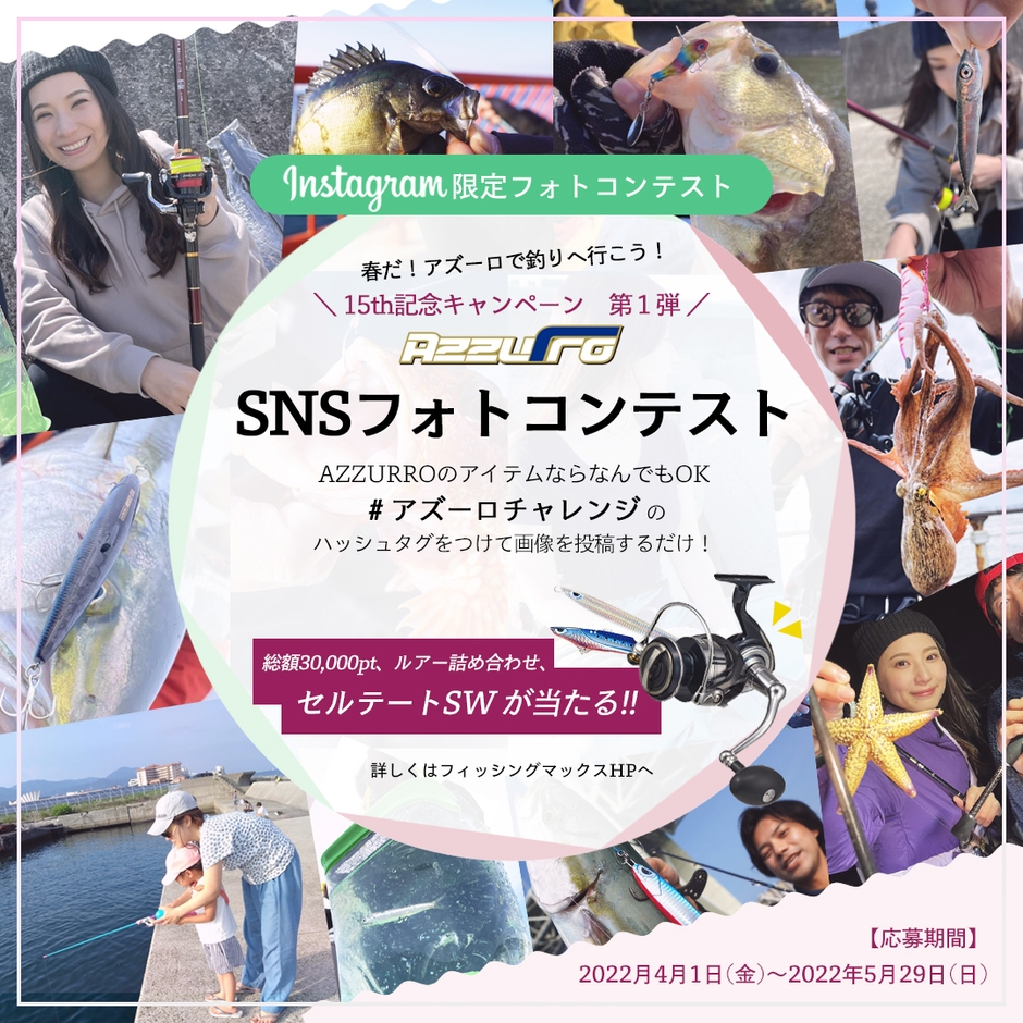 大阪湾の釣りを手軽に楽しくするルアーブランド「アズーロ」を扱う、株式会社フィッシングマックス(本社:兵庫県芦屋市、代表取締役社長:吉田 学)は、2022年4月1日から5月29日までの約2か月間、アズーロの15th記念としまして釣り応援イベントInstagramフォトコンテストを開催します。