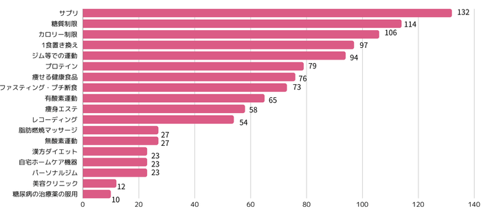 ・ダイエット方法のTOP3は「サプリ(64.4%)」、「糖質制限(55.6%)」、「カロリー制限(51.7%)」