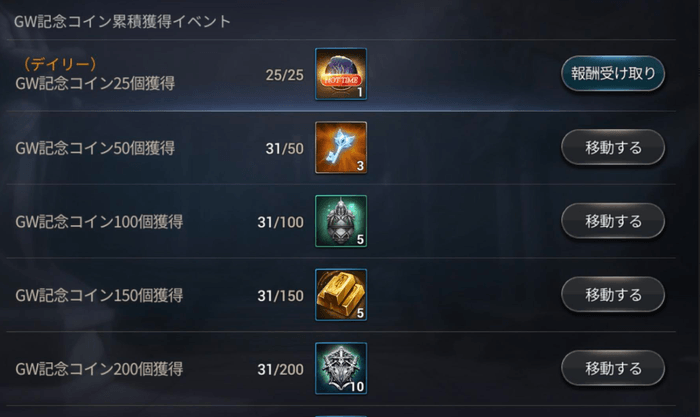 「GW記念コイン」は、獲得枚数に応じて様々なアイテムが獲得できます。