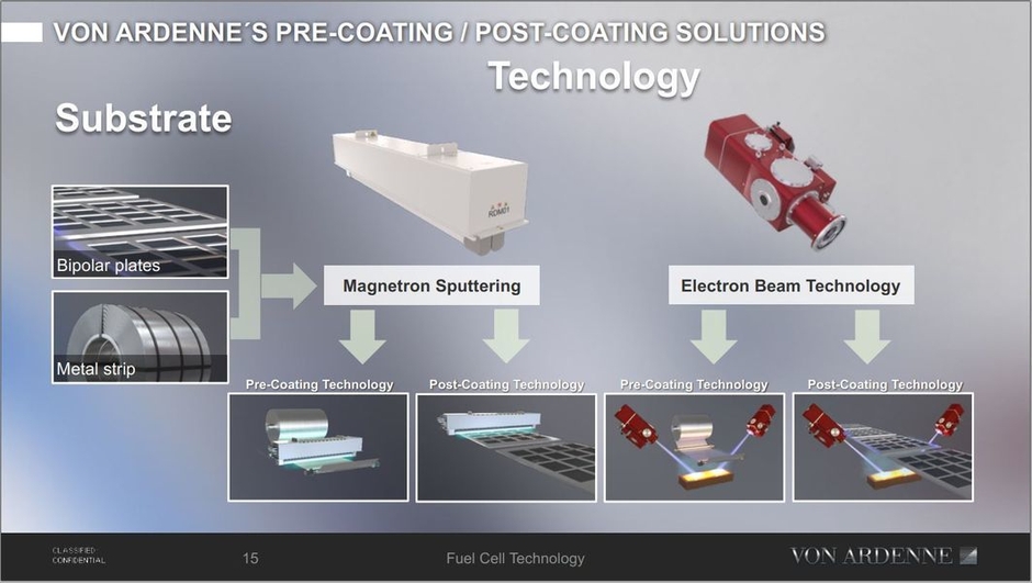 ドイツ・フォンアルデンヌ社は、真空成膜装置としてこれまで半導体や太陽電池製造装置を手掛けてまいりました。そこで培われた成膜技術を活用し、燃料電池セパレーターの耐腐食コーティング装置を開発しました。ステンレス製燃料電池セパレーターの耐腐食向けに、板金加工前のロール材へのプレコートや、プレス加工後のセパレーター単盤へのポストコート双方に対応する耐腐食カーボン成膜装置を提供します。