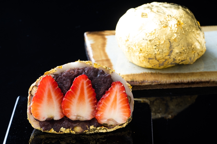 ジャンボサイズのいちご豆大福を丸ごと包みあげる金箔は前回の約1.5倍を贅沢に使用!