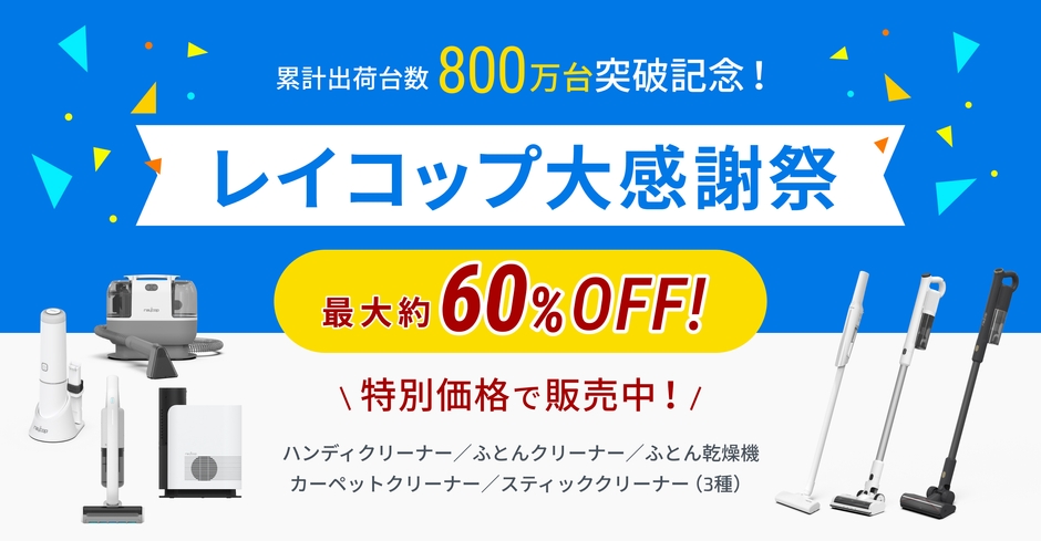 世界初のふとんクリーナーを生み出したレイコップ株式会社(本社:東京都千代田区 CEO:マイケル・リー)は、累計販売台数800万台を記念し、大掃除に活用いただけるクリーナー製品を対象に最大約60%OFFの【レイコップ大感謝祭キャンペーン】を2025年11月17日(月)~2025年12月15日(月)の期間にて開催いたします。また、本感謝祭に合わせて、掃除あとのホッと一息の時間にぴったりの電気ポット「ミルクメイト」が当たるSNSキャンペーンも実施いたします。