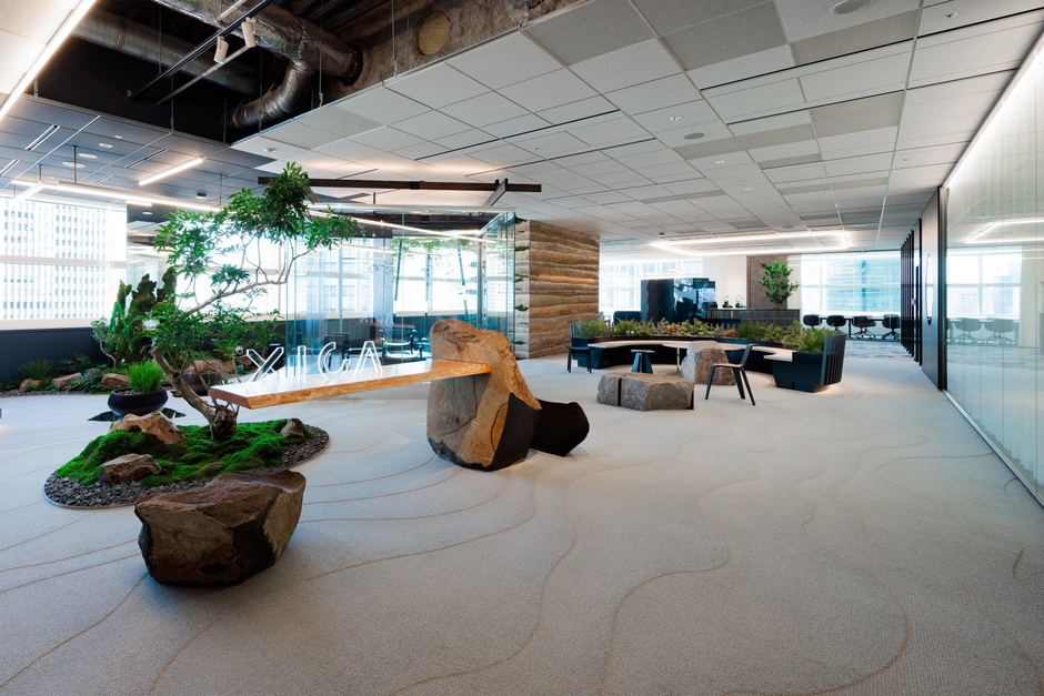 新オフィスでは、自然物と人工物という、一見して相反する両者が調和する空間デザインによって、才能開花とデータサイエンスの融合を表現しています。