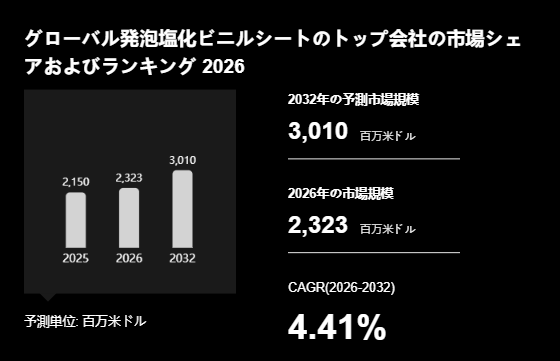YHResearch調査チームの最新レポート「グローバル発泡塩化ビニルシートのトップ会社の市場シェアおよびランキング 2026」によると、世界の発泡塩化ビニルシート市場は2025年に2150百万米ドル規模に達すると予測され、2026年には2323百万米ドルに拡大する見込みです。2032年までに3010百万ドルに達すると予測されており、2026年から2032年までの期間における年平均成長率(CAGR)は4.41%と予想されています。