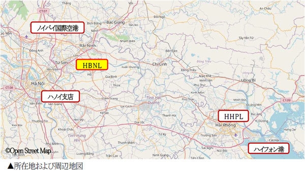 ベトナムではホーチミン、ハイフォンに次ぐ3拠点目となる新倉庫は、ハノイ・ノイバイ空港や、ベトナム北部最大の貿易港であるハイフォン港へのアクセスに優れる至便なローケーションにあり、日系企業も多数進出しているQue Vo工業団地やTien Son工業団地に隣接しています。