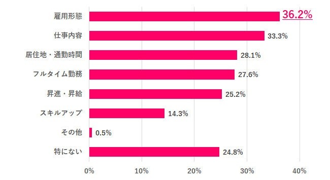 ライフイベント(結婚・出産・介護)を考慮して、自分のキャリアや働き方に関して、諦めた(もしくは諦めようと思っている)ことがあるか尋ねたところ、「特にない」と回答した人は24.8%でした。約4分の3の人が何かしら諦めた(諦めようと思っている)ことがあることがわかります。内容としては、「雇用形態」が最も多く36.2%でした。次いで「仕事内容」(33.3%)、「居住地・通勤時間」(28.1%)が続きました。