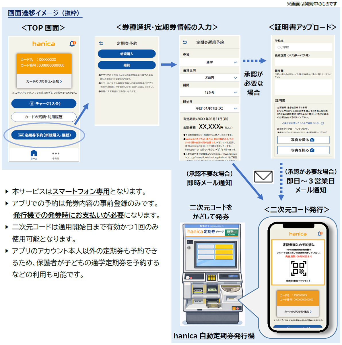 ◇従来、通学定期券の新規購入等には承認手続きのため案内所・営業所への来所が必要でしたが、本サービスではhanicaアプリ上で申請手続きが可能となり、窓口に来所することなく定期券をご購入いただけます。