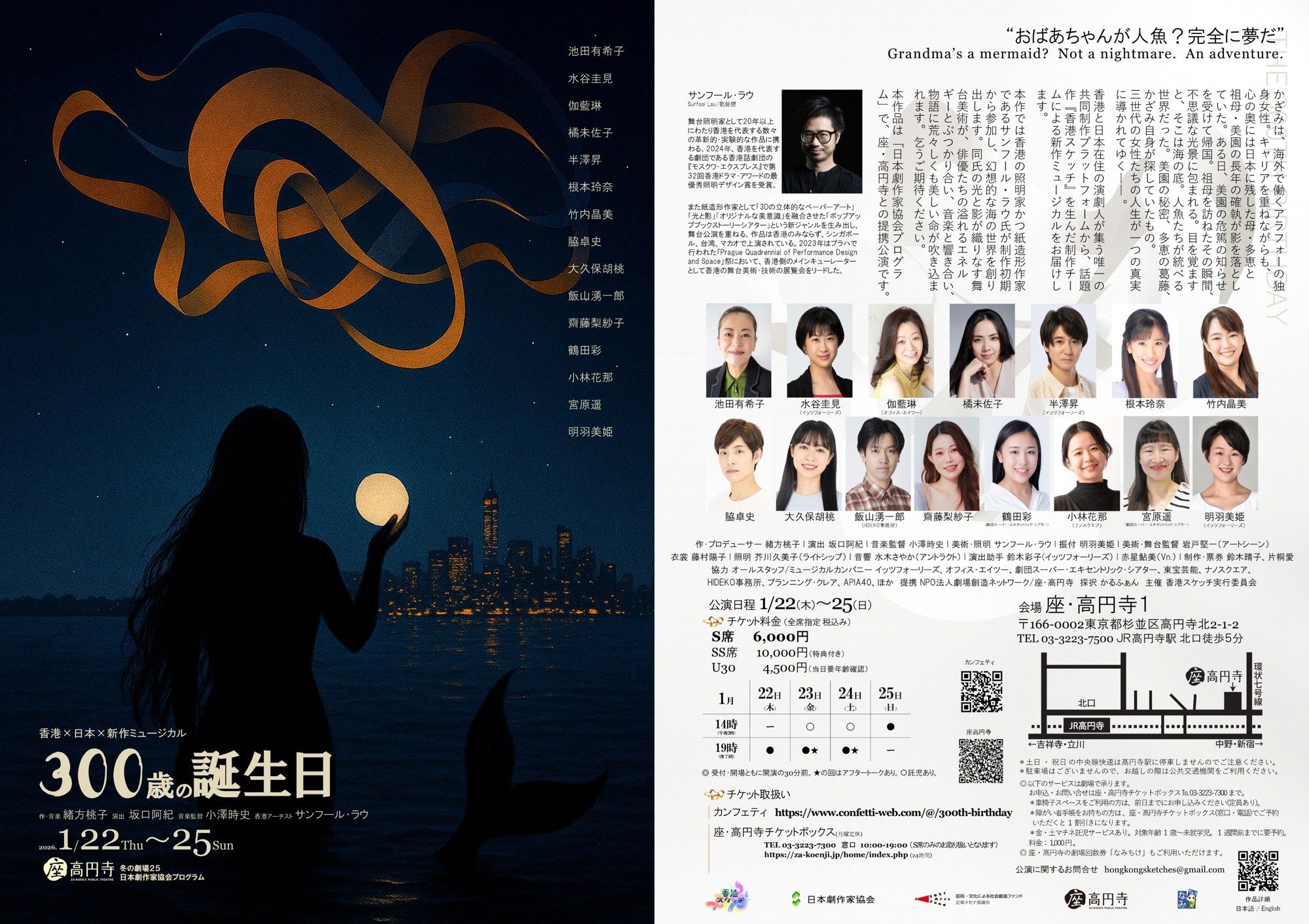香港と日本在住の演劇人が文化の違いを超えて舞台を共同制作する唯一のプラットフォーム。今まで見たことのないミュージカルを、お客様の心に届けたいと願いながら活動中。演劇による国際文化交流を推進するために、2025年は座・高円寺による子ども向けのワークショップ「香港からこんにちは~影絵をつなごう!~」、俳優とのワークショップ、創作過程をお客様にも体験していただく『300歳の誕生日・新曲お披露目ライブ』等を実施した。