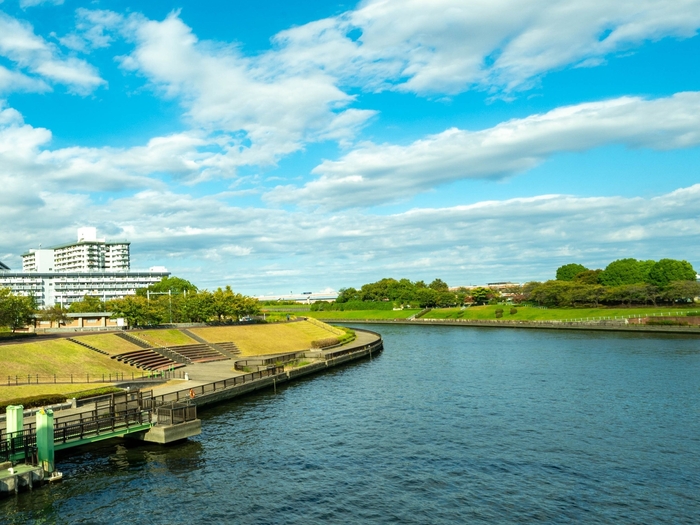 隅田川テラスとは、隅田川の両岸約47㎞の内、約37㎞の区間を整備し、堤防を補強する護岸基礎を親水施設として開放したエリアです。都心の貴重な水辺空間として、多くの方々に利用されています。