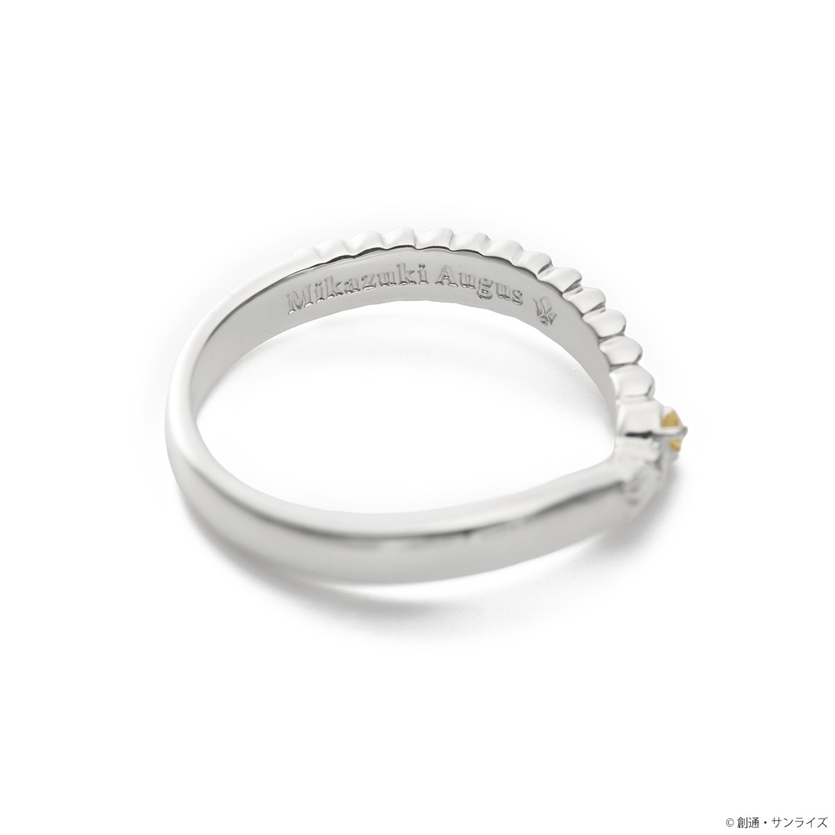 『機動戦士ガンダム 鉄血のオルフェンズ』10周年をお祝いしたシルバーリングです。三日月・オーガスモデルは、ブレスレットをモチーフに取り込んだV字デザイン。中央の三日月マークには、イメージカラーのストーンをセットし、内側には名前と鉄華団のマークの刻印を施しました。