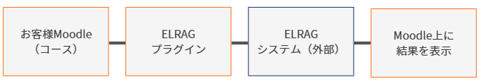 ELRAGはMoodleプラグインと当社のELRAGシステムにより提供されます。AI処理はELRAG側で実行され、Moodle側は最小限の連携で利用できる設計です。