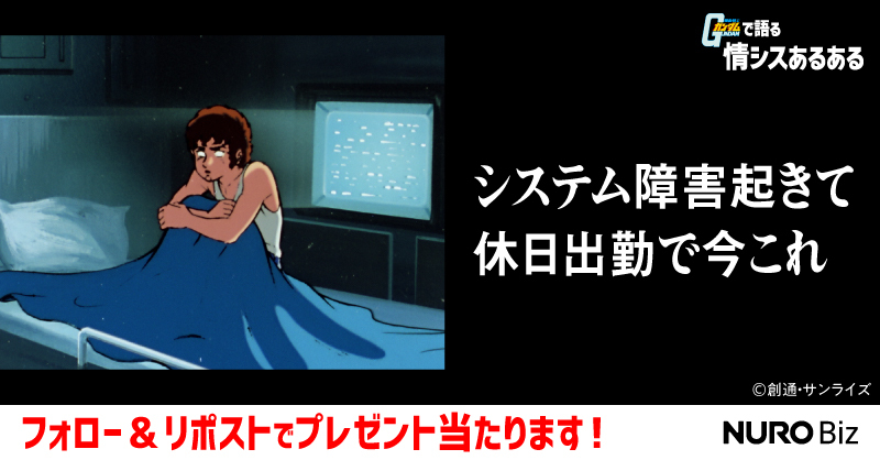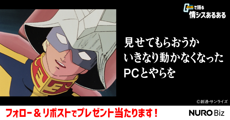 NURO Biz公式Xアカウント(@NUROBizbySony)で、情シス担当者が思わず共感できる「情シスあるある」を、『機動戦士ガンダム』の名シーン・名ゼリフとともに投稿します。「見せてもらおうか、いきなり動かなくなったPCとやらを」、「システム障害起きて休日出勤で今これ」など、情シスならば一度は経験したことのあるシーンを動画付きでお届けします。