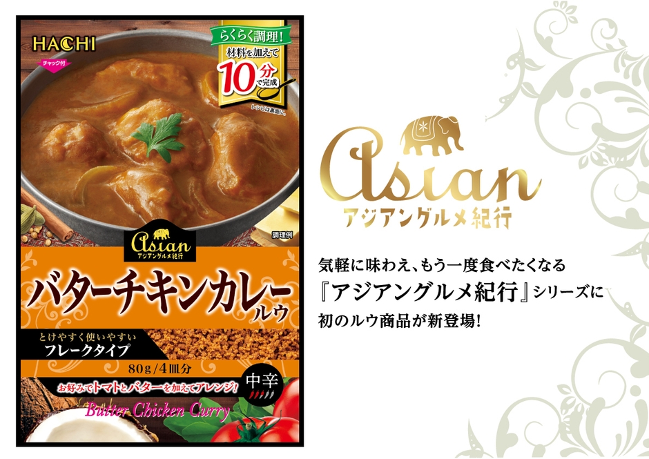 ハチ食品株式会社(大阪府大阪市、代表取締役社長:高橋 慎一、以下 ハチ食品)は、アジアン料理が気軽に味わえるシリーズ『アジアングルメ紀行』シリーズの新商品として、「バターチキンカレールウ」を2025年3月3日(月)に発売いたします。
