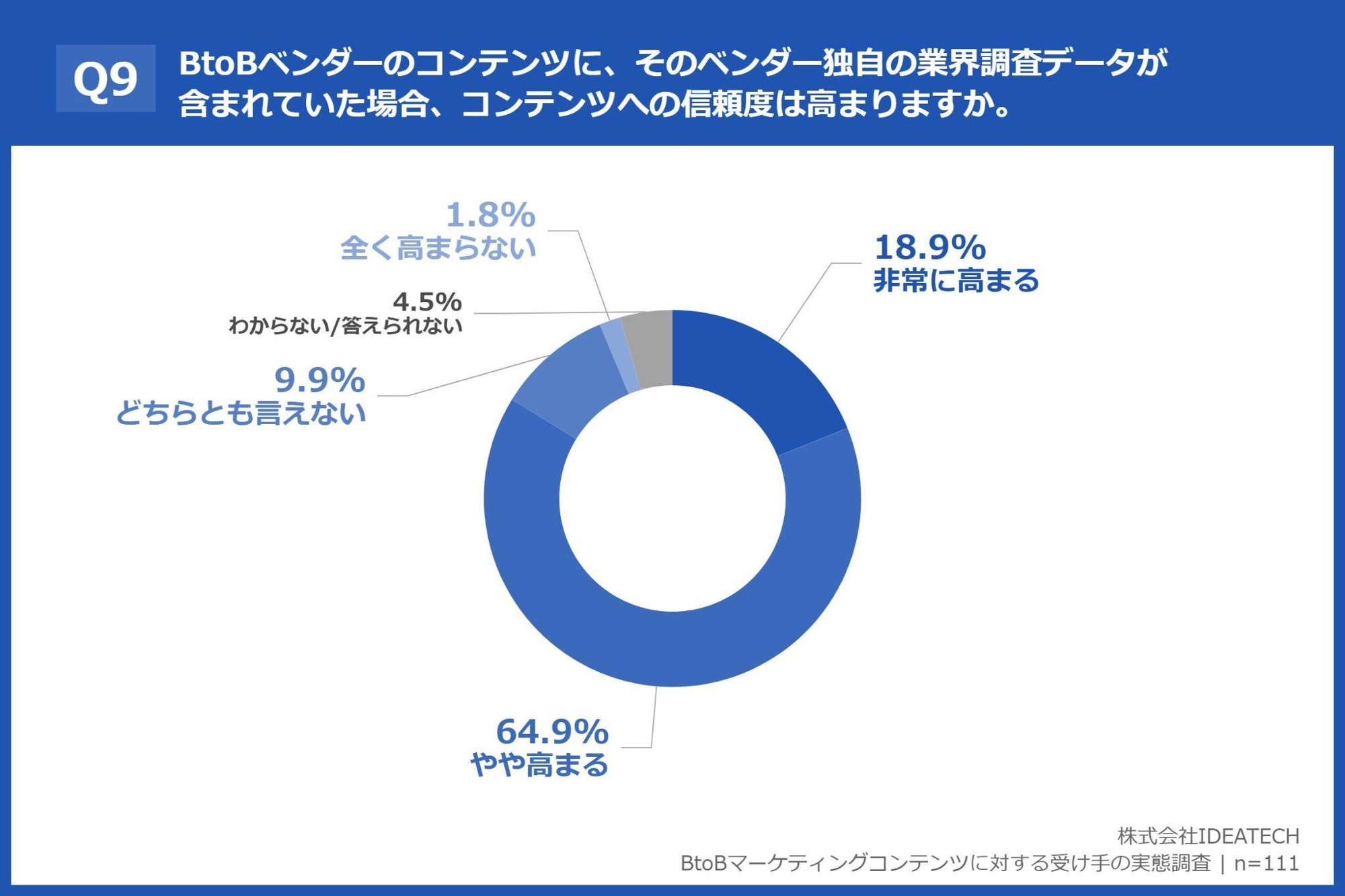 「Q9. BtoBベンダーのコンテンツに、そのベンダー独自の業界調査データ(同業他社の実態や課題を数値化したもの)が含まれていた場合、コンテンツへの信頼度は高まりますか。」(n=111)と質問したところ、「非常に高まる」が18.9%、「やや高まる」が64.9%、「どちらとも言えない」が9.9%という回答となりました。