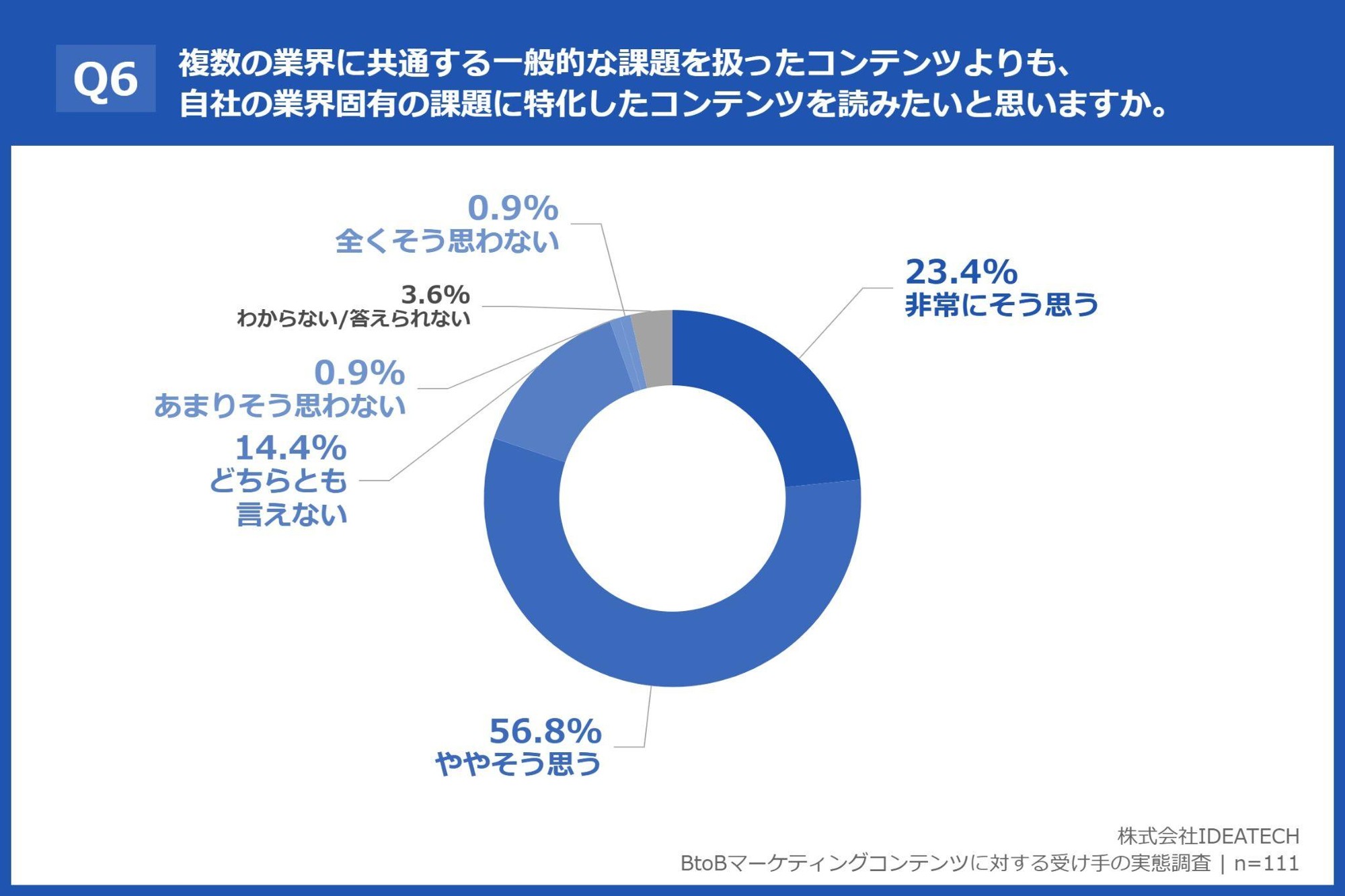 「Q6. 複数の業界に共通する一般的な課題を扱ったコンテンツよりも、自社の業界固有の課題に特化したコンテンツを読みたいと思いますか。」(n=111)と質問したところ、「非常にそう思う」が23.4%、「ややそう思う」が56.8%、「どちらとも言えない」が14.4%という回答となりました。
