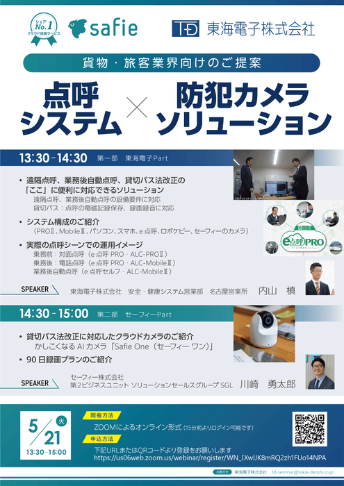 アルコール検知システム、 IT点呼システム、 運行管理システムを開発・販売する東海電子株式会社(本社:静岡県富士市 代表取締役 杉本 哲也)は、 この度、 セーフィー株式会社様との合同ウェビナー「貨物・旅客業界向けのご提案 点呼システム×防犯カメラソリューション」を5月21日(火)に無料開催いたします。