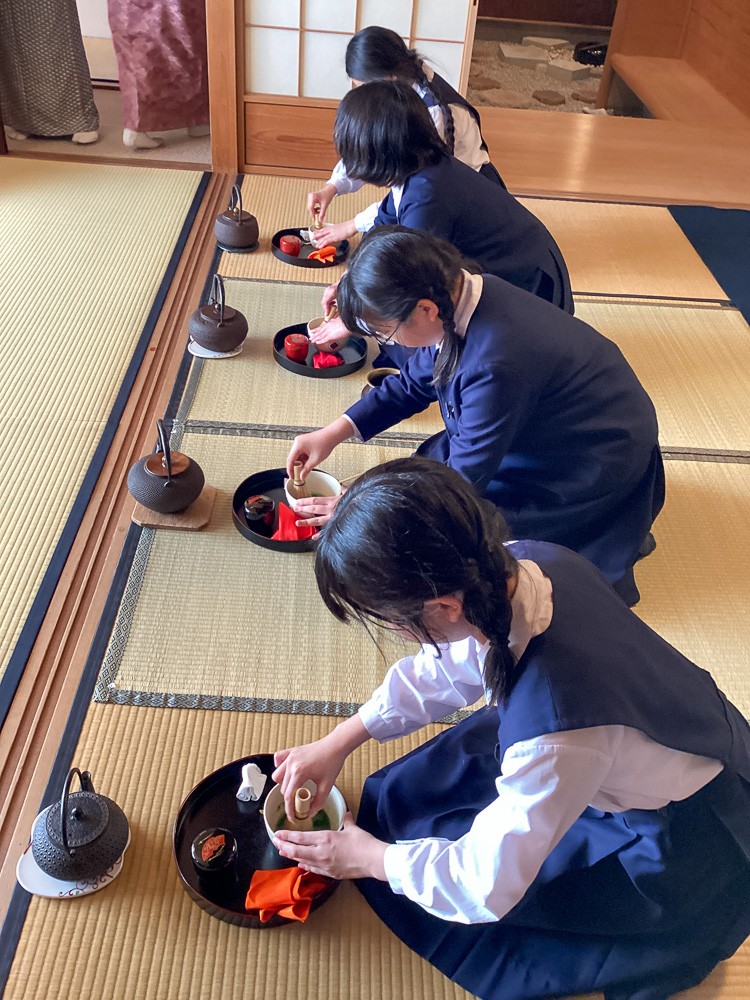 児童らは、同敷地内の中高校舎にある本格的なお茶室「信和庵」において、裏千家大阪東学校茶道連絡協議会の黒川先生から指導を受けています。小学校の教育課程では体験することが難しい本格的な茶道を学べる環境は、本校の特色ある取り組みの一つです。