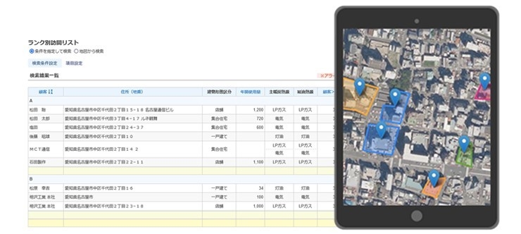 顧客属性、さらに「住宅リフォーム時、ガス器具を入れ替えた顧客」「前回の検討から半年が経過した顧客」など、新旧問わず蓄積された顧客情報・案件情報などをセグメント分けして「顧客ターゲットリスト」として作成します。さらに色分けした「訪問マップ」として示すことで、新規開拓すべき顧客の見える化につなげます。