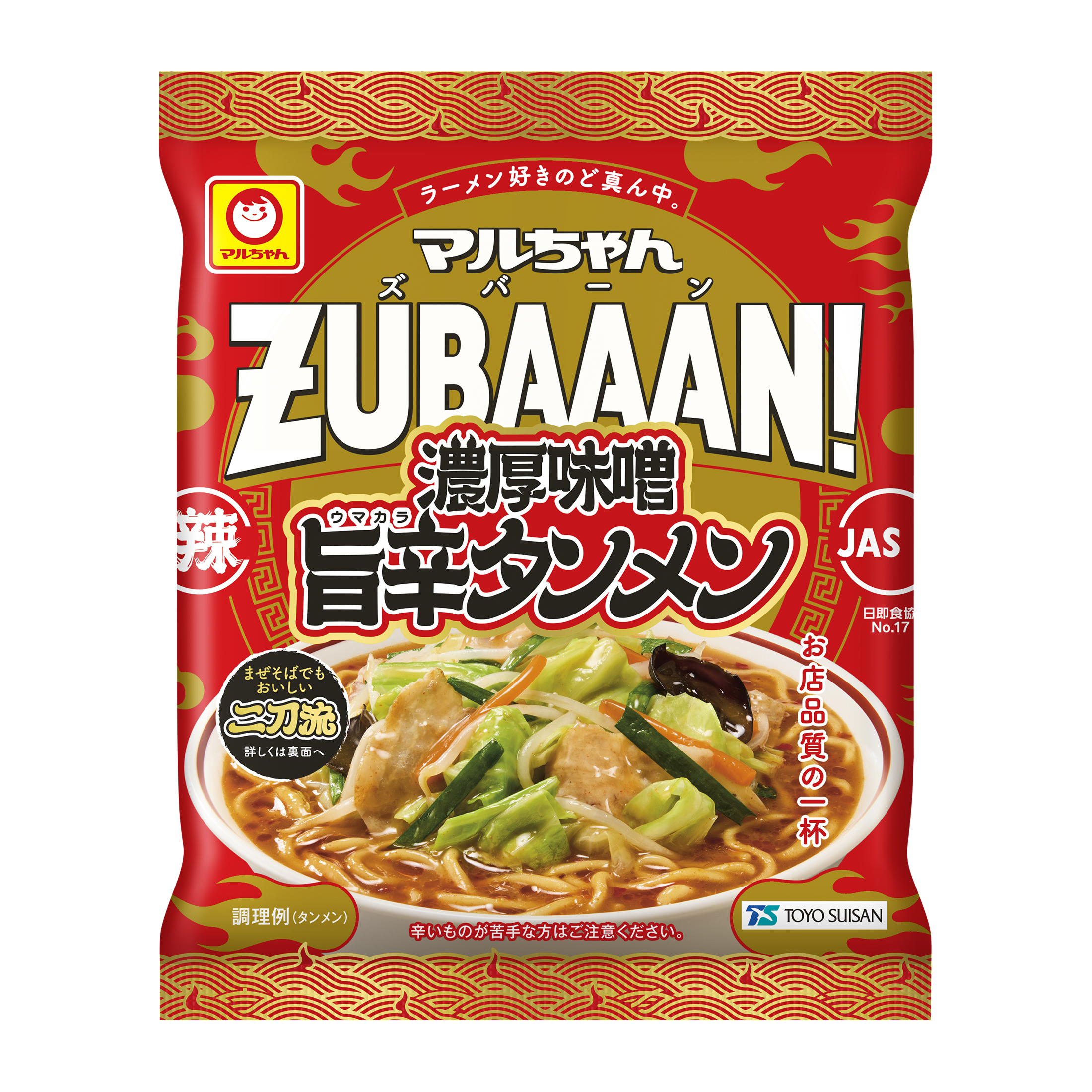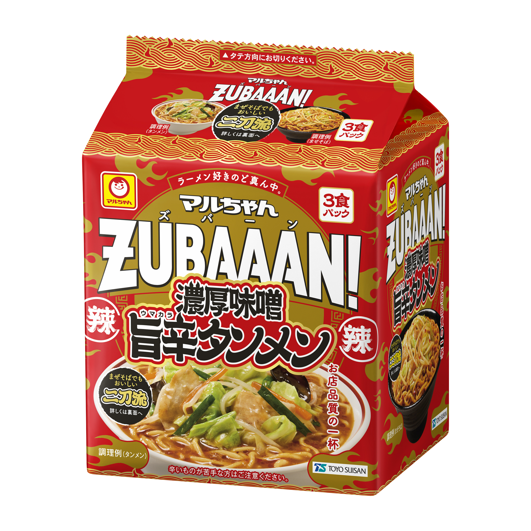 「マルちゃんZUBAAAN!」は、「誰もがお家(うち)にいながらにして、手軽に"お店品質のあの味"を楽しめるラーメン」がコンセプトの即席袋麺のブランドです。当社の新技術を取り入れた麺に、今までにないスープでお店品質のクオリティを実現し、食べた瞬間に脳と心に「ZUBAAAN!(ズバーン)」と"響き"、"記憶に残る"、ラーメン好きのど真ん中に刺さるようなインパクトのある味わいです。この度、同ブランドで初となる辛系の一杯が登場します。タンメンとまぜそばの二刀流の食べ方でお楽しみください。