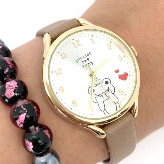 まずは人気のかえるのピクルスから。レザー風のブラウンベージュのベルトとゴールドカラーのフチがシンプルな腕時計です。