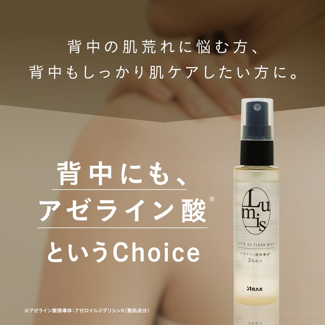 【新発売】背中ケアにもアゼライン酸というChoice。全身に使える肌荒れ対策ミスト。アゼライン酸3%配合『ルミス AZ クリアミスト』