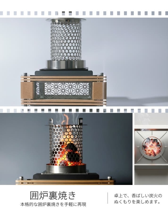 炎の光・音・香り・ぬくもり・味わい──五感を呼び覚ます設計で、鑑賞から囲炉裏焼き、卓上調理、インテリア暖炉まで、これ一台で多彩に使える多機能卓上火鉢です。