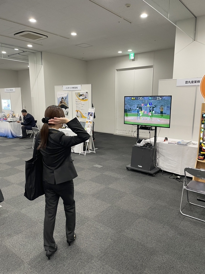 画面上の視覚情報に反応しながら身体を動かすことで、バランス動作や注意の持続といった要素にアプローチできる点が特徴です。学会当日は、来場した作業療法士や医療・福祉関係者が実際に体験する様子が多く見られました。