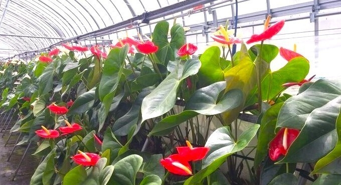 見学 :ビニールハウスで栽培したアンスリウムの生花展示