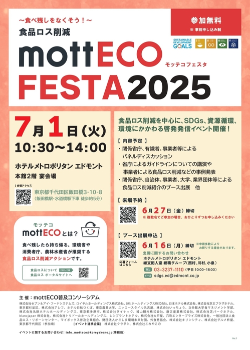 SRSホールディングス株式会社(本社:大阪府大阪市、代表取締役社長:重里 政彦、以下SRSグループと記載します。) が参加する産官学アライアンス「mottECO普及コンソーシアム※」では、食品ロス削減の啓発イベント「mottECO FESTA(モッテコ フェスタ)2025」を主催、開催しますのでお知らせします。