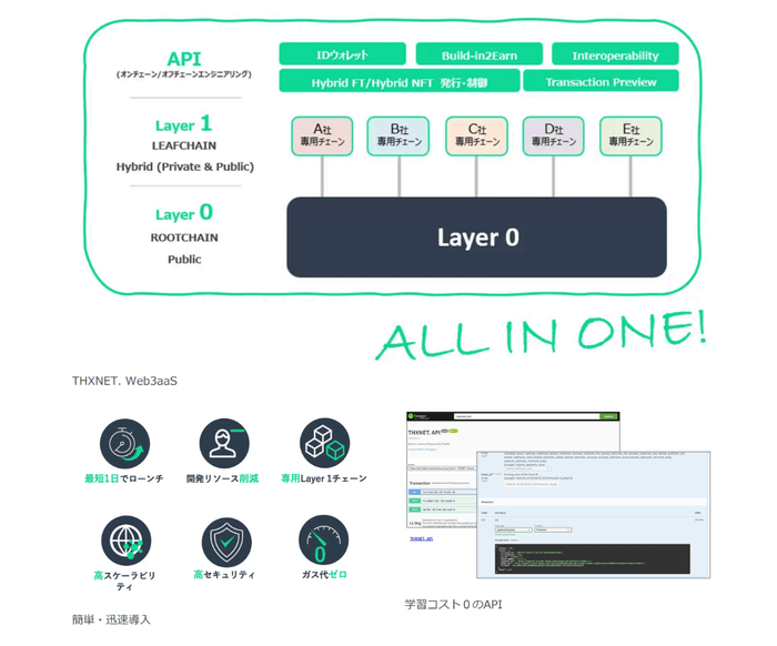 この度提供を開始する「THXNET. Web3aaS」は、個社ごとに独立した専用L1ブロックチェーンを、最短1日で導入できる“プラグ&プレイ型”Web3インフラサービスです。月額固定費用のオールインワンパッケージとなっており、ガス代ゼロ、ノードやエクスプローラーサーバ*1運用も全て標準搭載されています。 APIは直感的に操作できるため、ブロックチェーン専任のエンジニアでなくても、Web3機能を利用することができ、IDウォレット、NFT、オンチェーン/オフチェーン統合、マイナンバー対応のSBT(Soul Bound Token)発行等、企業独自の様々なファンジブルトークンの発行・運用も標準機能として実装しています。