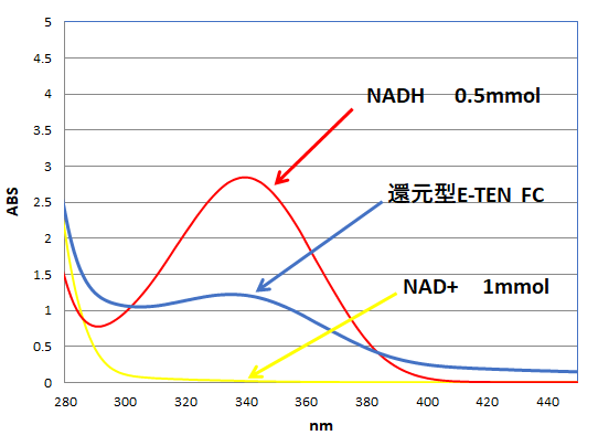 準備 NAD+1mmol/L水溶液・・・・NAD+0.0663gを精製水100mlにて調整 NADH0.5mmol/L水溶液・・・NADH0.0035gを精製水10mlにて調整 NAD+1mmol/L水溶液15mlに還元型E-TEN FCを0.03g投入した溶液 山梨県産業技術センターの紫外可視分光光度計(株式会社島津製作所)にて測定。 結果は下記の通りになります。