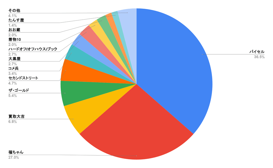 アンケート回答者が着物の買取を依頼した業者としては、「バイセル」が36.5%と最も多く、次いで「福ちゃん」(27.0%)、「買取大吉」(6.8%)、「ザ・ゴールド」(5.4%)が続く結果となりました。全体として大手事業者に利用が集中する傾向が見られます。