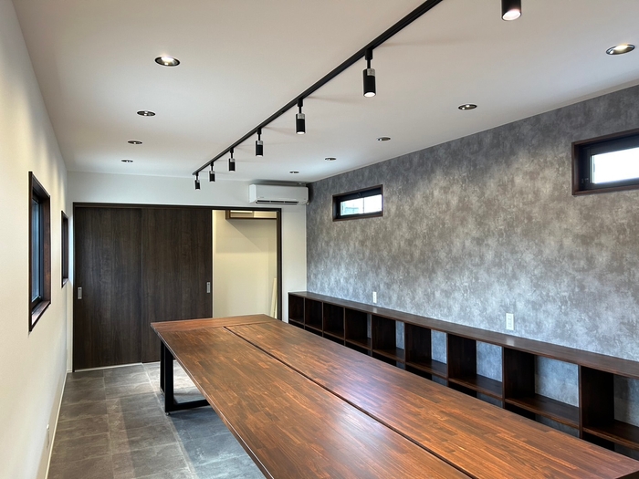 大きさは最大サイズのW3,500×L11,000を使用し、ご要望として頂いていたシックな内装に仕上げました。7名用の造作デスク、書類やカタログを収納するための造作棚、扉の奥には収納スペースをご用意しました。間仕切り壁やパーテーションを用いて、将来的に応接室を設けられるよう、空間にゆとりを持たせました。
