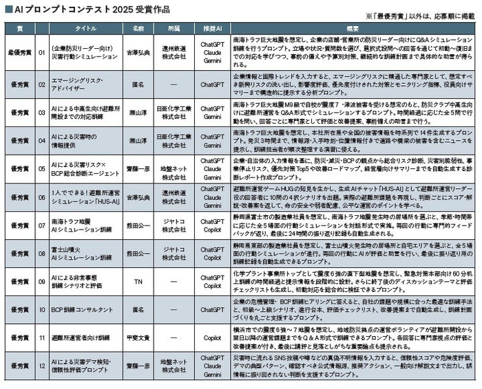選定された12 のプロンプトは、12月19日に発刊する危機管理白書2026(https://www.risktaisaku.com/articles/-/107983)で概要を紹介するとともに、すべてのプロンプトも公開する予定。