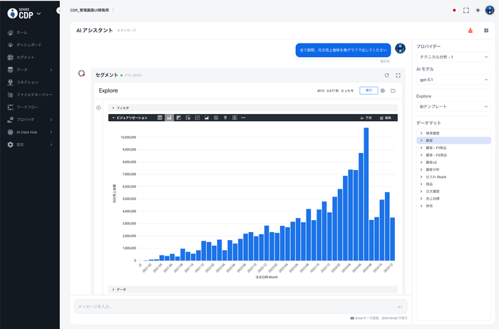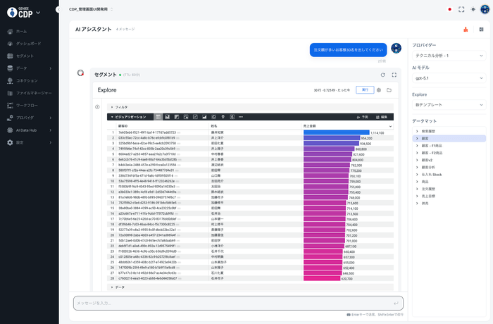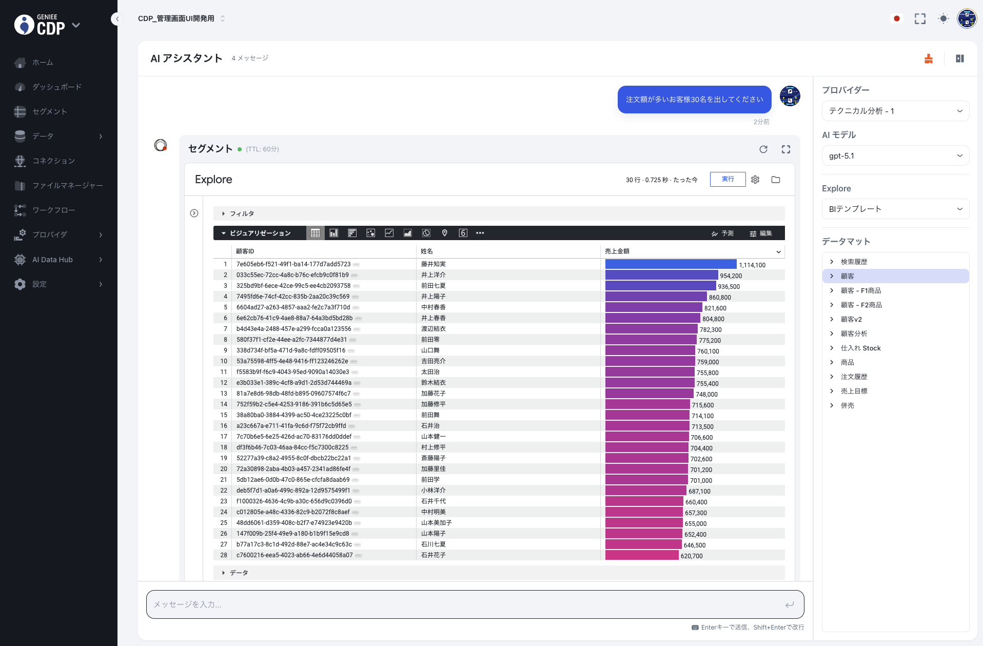 本機能は、「注文額が多いお客様上位30名を出してください」「全期間の月次売上推移を棒グラフで出してください」といった自然言語での指示だけで、GENIEE CDP上のデータを自動集計し、表やグラフ形式のダッシュボードを生成する機能です。