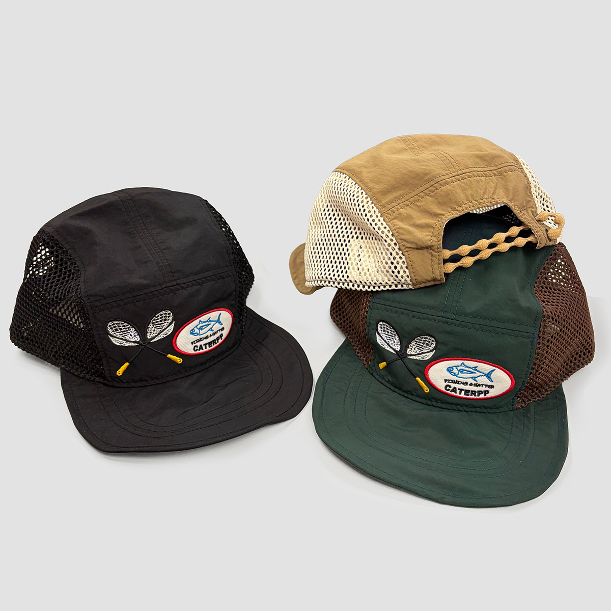 フロントには「タモ(体験をキャッチするゲン担ぎ)」とFISHING&HATTERのメッセージを込めたワッペンを配置し、カジュアルなデザインに仕上げました。
