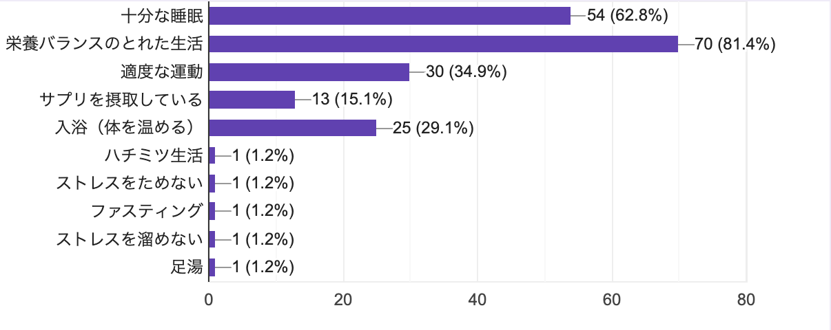 ■免疫力を高めるために心がけていることを聞くと、1位「栄養バランスのとれた生活」(81.4%)、2位「十分な睡眠」(62.8%)、3位「適度な運動」(34.9%)という結果でした。