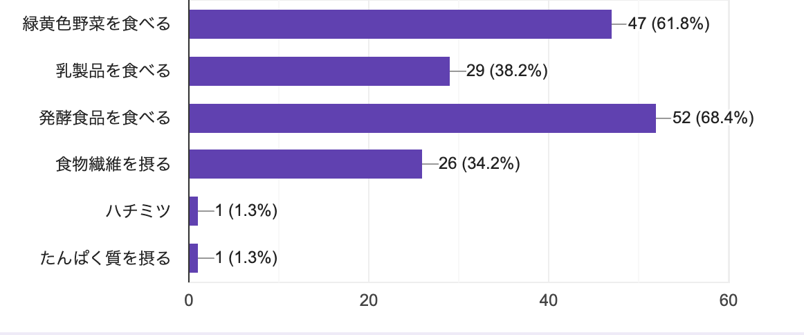 ■免疫力を高めるために食生活で意識していることを聞くと、1位「発酵食品を食べる」(68.4%)、2位「緑黄食野菜を食べる」(61.8%)、3位「乳製品を食べる」(38.2%)という結果でした。