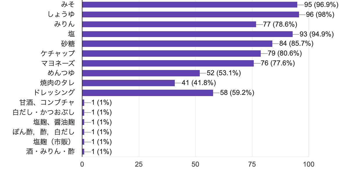 1位「みそ」(96.9%)、2位「しょうゆ」(98%)、3位「塩」(94.9%)、4位「砂糖」(85.7%)、5位「みりん」(78.6%)