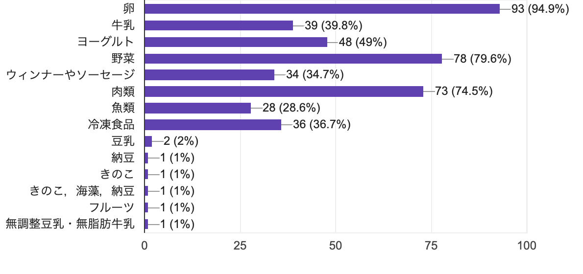 ■冷蔵庫にいつもある食材・よく使う食材は何かを聞くと、1位「卵」(94.9%)、2位「野菜」(79.6%)、3位「肉類」(74.5%)、4位「ヨーグルト」(49%)という結果でした。