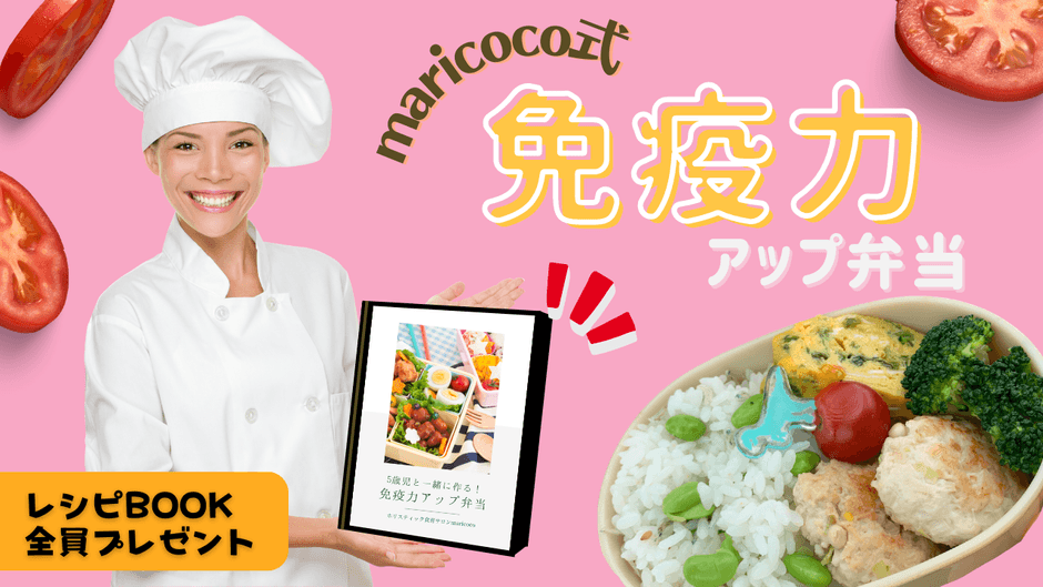 しかし、バランスよく食べるということはとても難しいため、ホリスティック食育サロンmaricocoでは、日々の食事から【免疫力を高める】ためのヒントを盛り込んだ【maricoco式 5歳児と一緒作る免疫力アップ弁当BOOK】をプレゼントいたします。