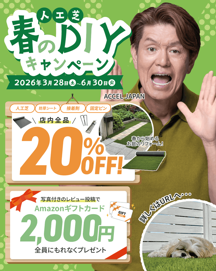 店内全品(人工芝関連商品)20%OFFで提供するほか、ご購入後に写真付きレビューをご投稿いただいたお客様へ、Amazonギフトカード(Eメールタイプ)2,000円分をプレゼントいたします。