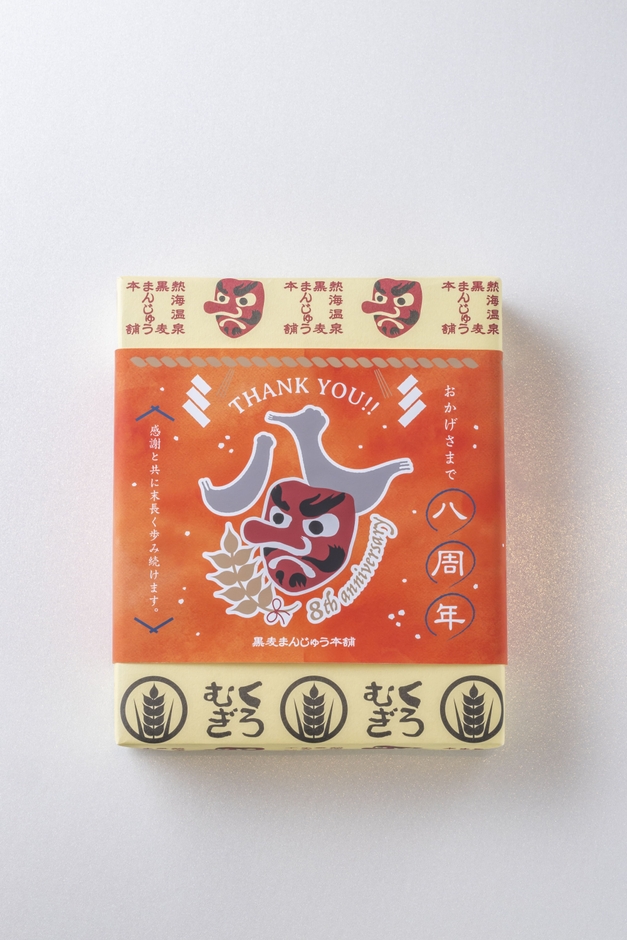 黒麦まんじゅう本舗8周年をお祝いし、周年祭を盛り上げ、お客様に一層感謝の気持ちをお伝えできるようにとデザインしたのし紙を箱に包装して期間限定で販売いたします。