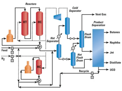 水素化裂解プロセスは、不純物である硫黄・窒素成分の除去能力に優れ、製品品質の向上と環境負荷低減を同時に実現できる点が特徴である。さらに、既存の蒸留装置や他のハイドロプロセスと統合することで、製油所全体の効率性と経済性を向上させることが可能である。