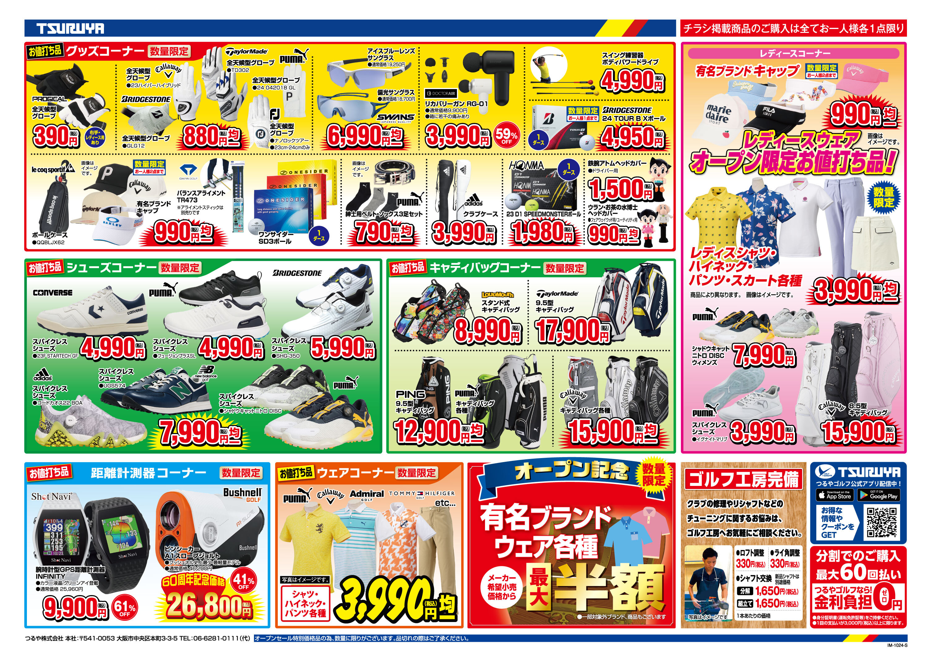 オープン当日より、お得なキャンペーンを実施いたします。キャロウェイのEPIC SPEEDドライバーが19,900円。キャロウェイのAi-SMOKEドライバーが27,900円。テーラーメイドのQi10ドライバーが34,900円、同モデルのフェアウェイウッドが19,900円。PINGのi525アイアン5本セットが59,900円。ODYSSEYの21DFXパターが9,900円。プーマのスパイクレスシューズが4,990円から7,990円。PING、プーマのキャディバッグ各種が12,900円。有名ブランドウェア各種が最大半額など、大特価商品を多数ご用意!レディース用商品も数多く取り揃えております。