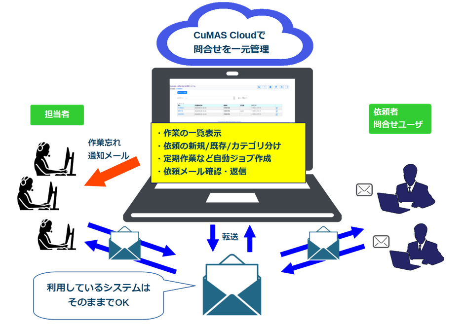 本サービスは、問い合わせメールを自動的にシステムへ登録し、WEBブラウザから問い合わせの進捗状況や担当者を管理できるようにするものです。これにより、問い合わせの対応漏れを防ぎ、業務効率を改善できます。